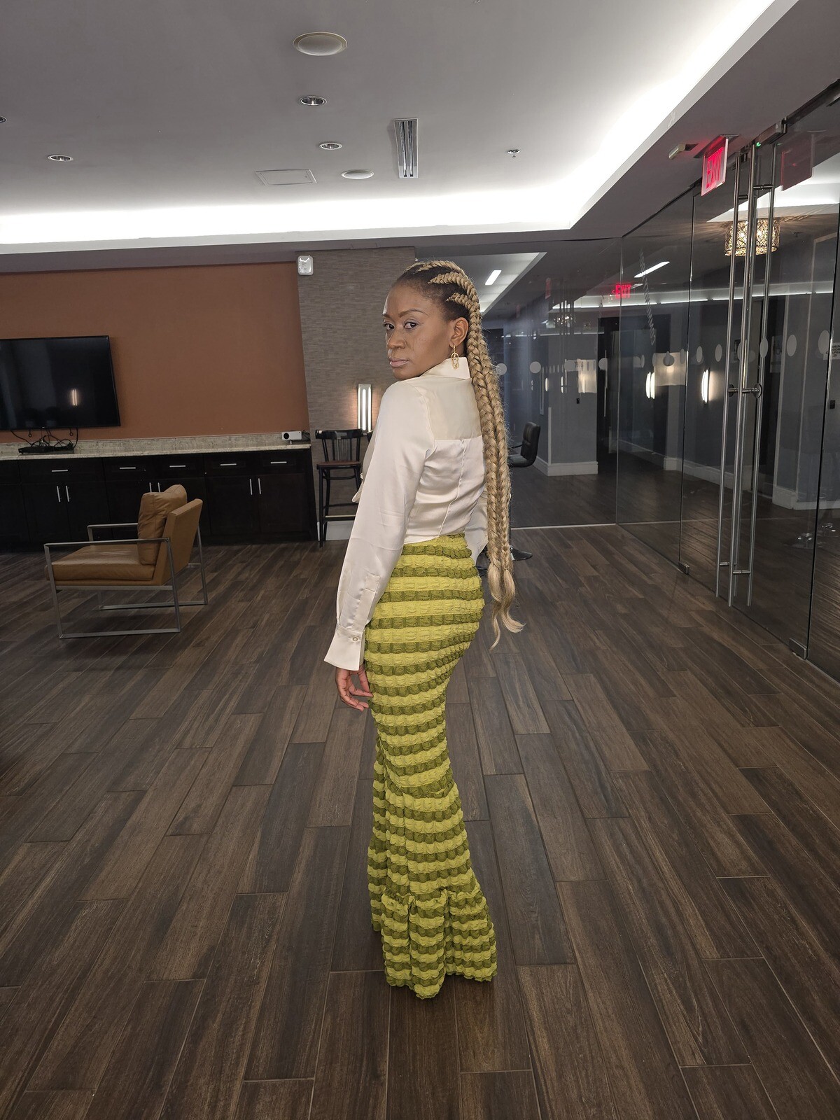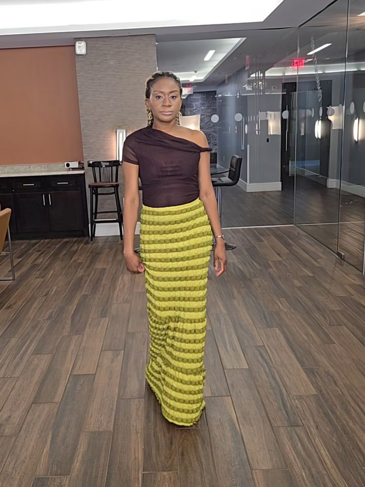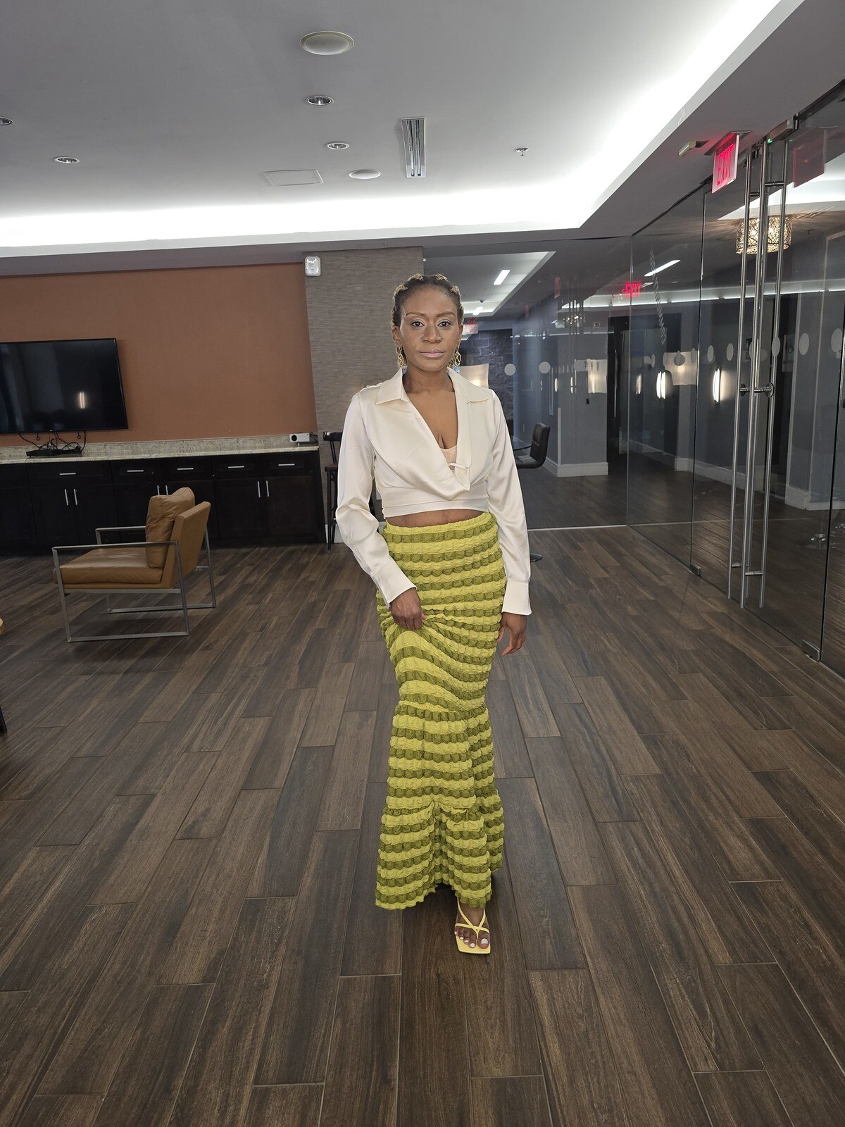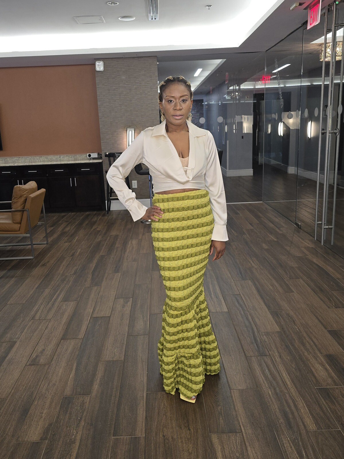 Sophisticated high waisted long skirt which features a form-fitting design that flares out into a mermaid-style ruffled hem at the bottom. This piece can also be worn as a tube dress. Shirts shown are not included.