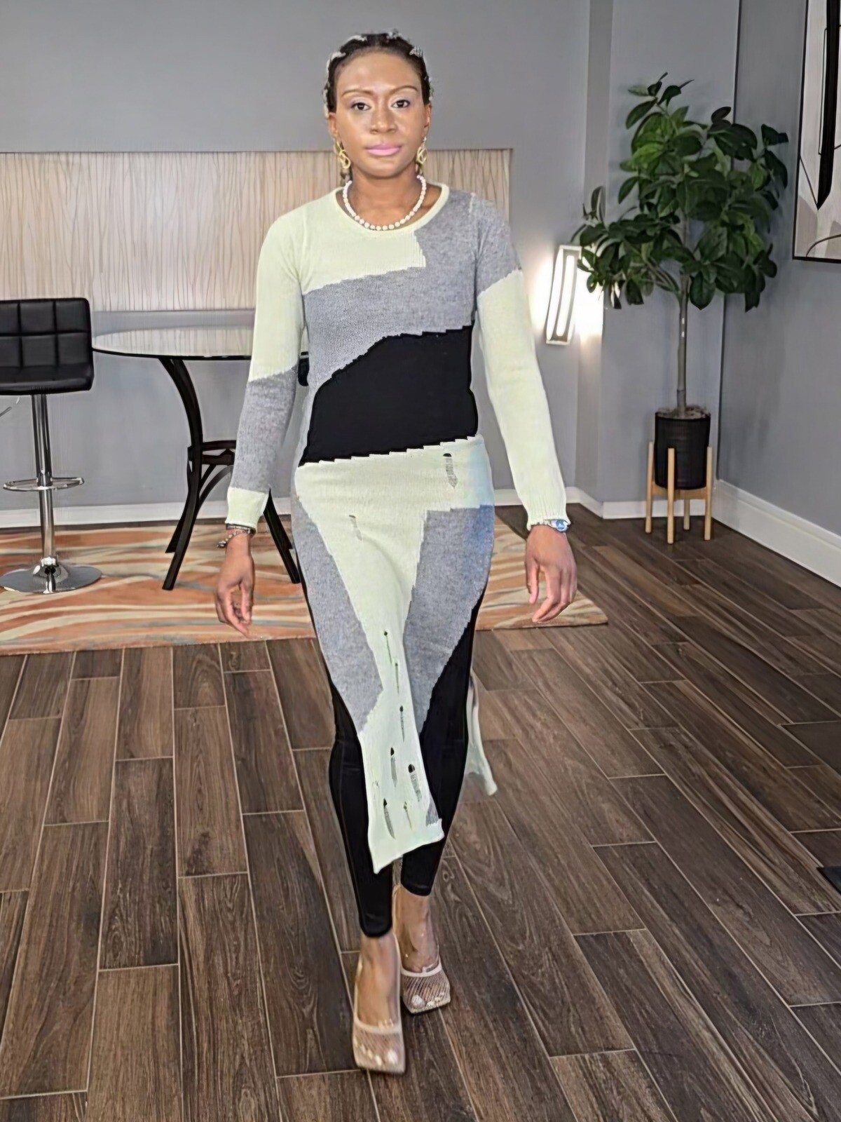 This tunic sweater features a round neck, side-splits hemline, a blended shades of black, gray, and sage color, giving it a modern and edgy aesthetic. Made from a knitted fabric, it has a deconstructed style, with visible stitching details and intentional distressing.