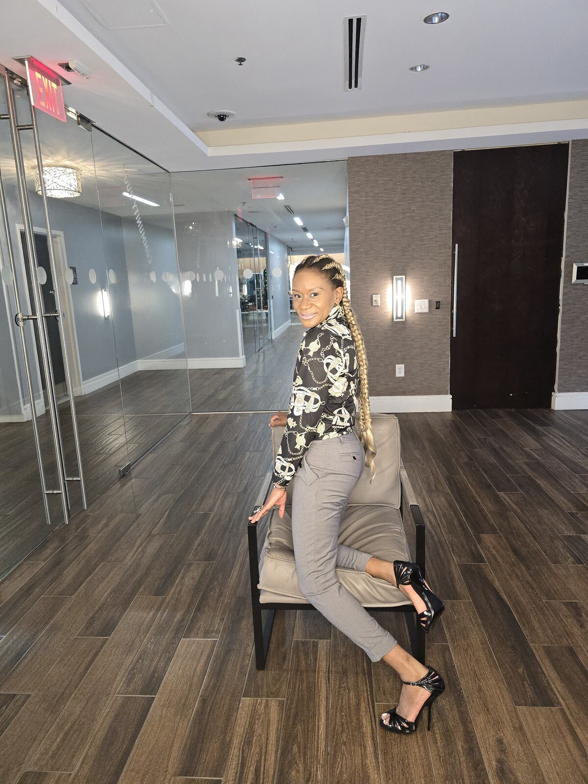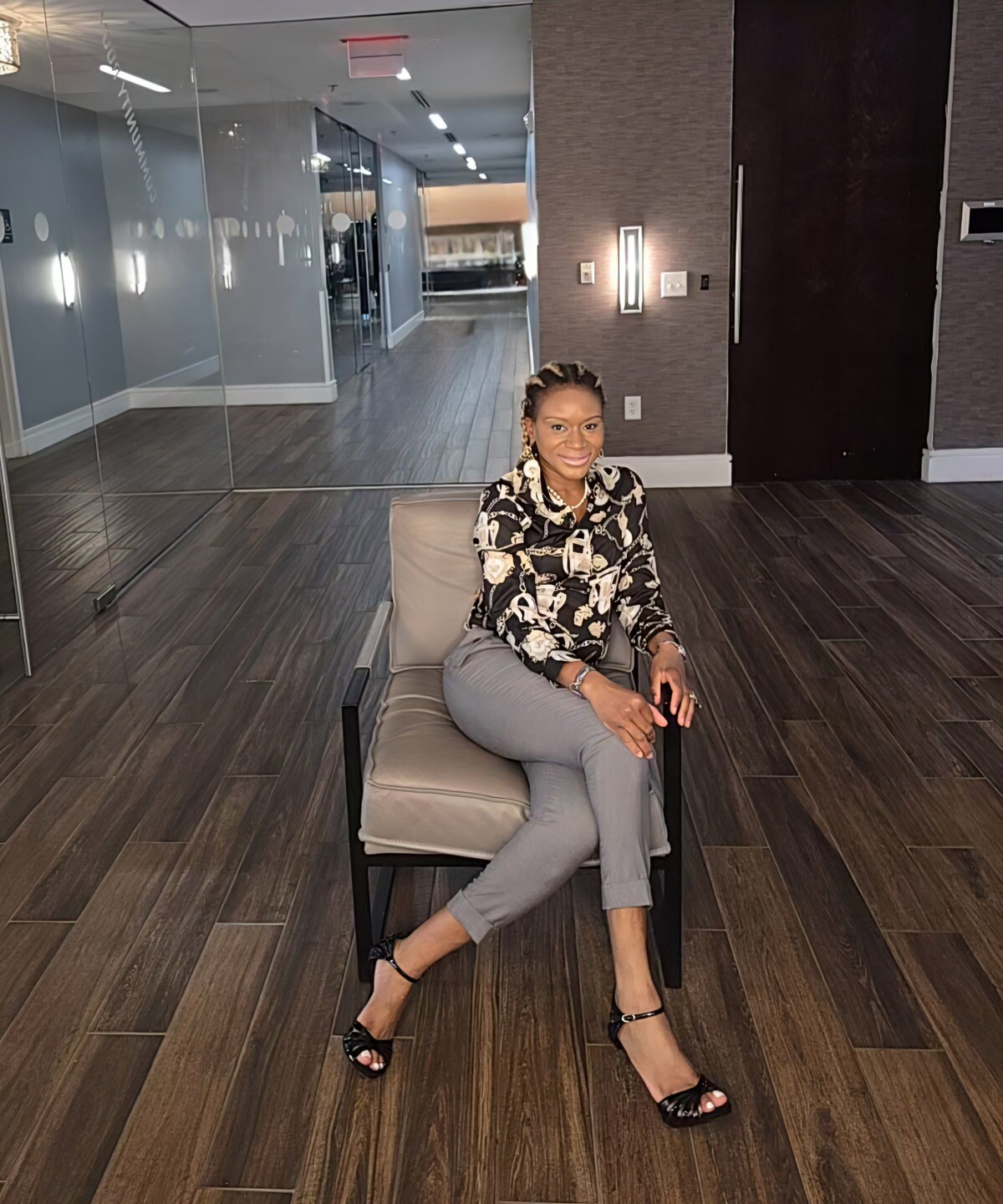 Luxurious chain print shirt featuring a neck collar, button-down front, and button at cuff. This shirt is versatile, ideal for formal and casual occasions. Skirt or trouser shown are not included.